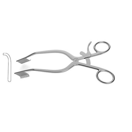 angled arms, 7x7 sharp prongs, 32.0 mm deep, 8-3/4" (22.0 cm)Miskimon Cerebellar Retractor is ideally suited for use in procedures that require cerebellar retraction. The cerebellum itself can be cushion and safe from damage by the placement of cotton strips. This retractor can be used to secure soft tissue and move it to clear the surgical field. This instrument has angled arms and sharp prongs making it able to effectively grip tissue and secure it with a ratcheting mechanism.