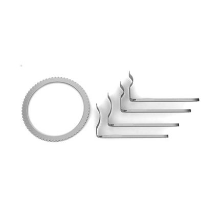 Universal Ring Retractor Small Incision Set includes a round segmented ring that is 8 ½" in diameter, which can be used on smaller patients or smaller incisions. This ring operates as a docking site for retractor blades that are used to pull back the edges of a wound.