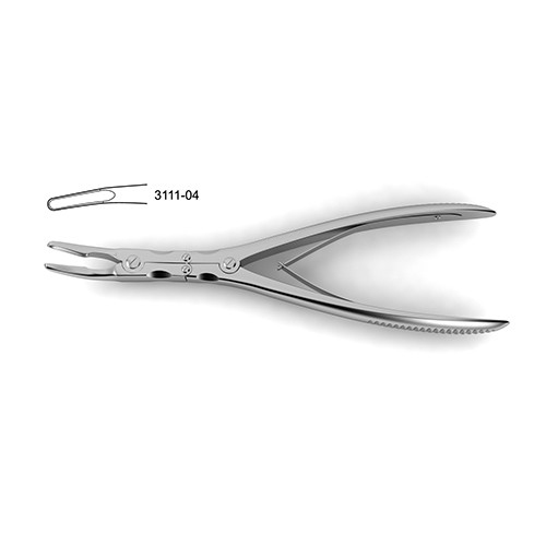 angled handle, straight 17.0 mm jaws, 7" (18.0 cm)Goldman-Kazanjian Rongeur is a specialized instrument for use in handling of small bones and other bony tissue layers. The jaws of this instrument are 17.0 mm and straight making them well suited for quick, precise cuts across bony plains or small bones. Additionally the angled handles allows the cutting surface to remain parallel to the instrument while the handle is offset to make it comfortable to grip and maneuver for the surgeon.