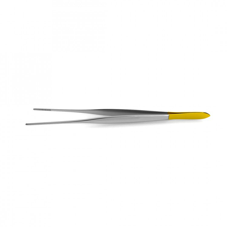 Cushing Thumb Forceps are handcrafted from tungsten carbide for a durable and strong instrument with a crosshatched surface to provide a secure grip. These instruments have serrated tips, a scraper end and are available in a standard, delicate, bayonet, or straight model. The very thin tip is easy for maneuvering. Tungsten carbide forceps feature tips made from tungsten carbide, the hardest metal made for surgical instruments. Precision-milled serrations are formed onto the tungsten carbide inserts, resulting in pyramid-shaped teeth that provide a non-slip grip. Pyramid-shaped teeth align perfectly with each other to provide a durable and reliable grasp of the most delicate or toughest tissues, as well as needles, sutures, dressing materials and delicate vessels. Smooth tungsten carbide inserts are also available for delicate procedures. Spring tension allows for surgeons to maintain proper and consistent position, ensuring optimal grip without having to apply excess force. These forceps feature gold-plated handles.