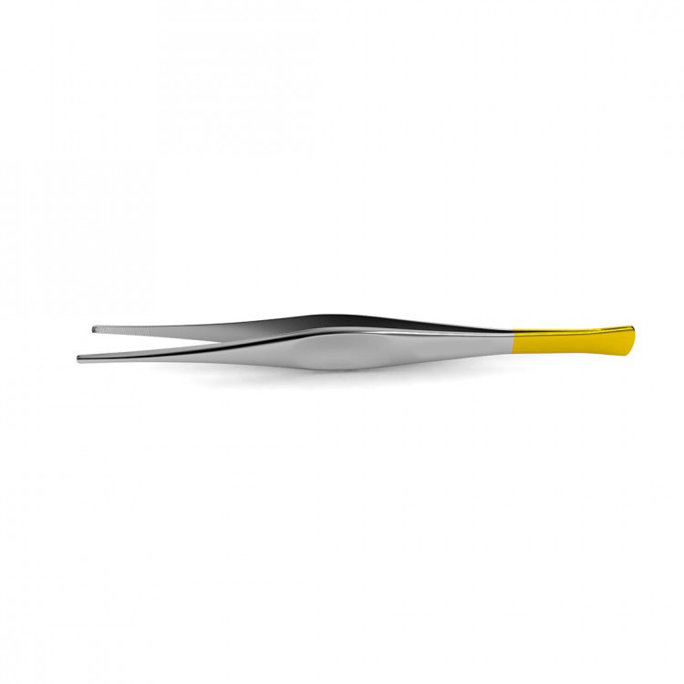 Ferris-Smith Needle Forceps are handcrafted from tungsten carbide for a durable and strong instrument with a serrated surface to provide a secure grip. Designed with 1×2 teeth and a wide thumb grip, these forceps offer a steady handling by the surgeon as well as a secure grip on tissue. Tungsten carbide forceps feature tips made from tungsten carbide, the hardest metal made for surgical instruments. Precision-milled serrations are formed onto the tungsten carbide inserts, resulting in pyramid-shaped teeth that provide a non-slip grip. Pyramid-shaped teeth align perfectly with each other to provide a durable and reliable grasp of the most delicate or toughest tissues, as well as needles, sutures, dressing materials and delicate vessels. Smooth tungsten carbide inserts are also available for delicate procedures. Spring tension allows for surgeons to maintain proper and consistent position, ensuring optimal grip without having to apply excess force. These forceps feature gold-plated handles.