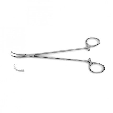 Right angle, 4-3/4" (12.1 cm) Dietrich Clamp is 4 ¾" and contains serrated jaws that are curved at a right angle that can help to grasp blood vessels that are harder to reach. This clamp provides a secure method of occluding blood flow to smaller vessels due to its locking mechanism on the inner part of the ring-handles. The ratchet device allows for a precise grasp and can easily be positioned onto the end of a vessel.
